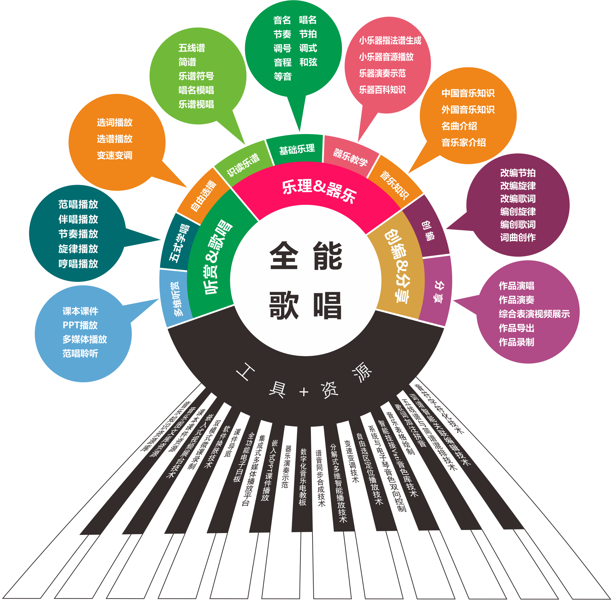 基于自主创新研发的音乐简线词智能混排、分解式多维播放技术、智能生成参照谱等多项核心技术,以歌唱教学、器乐教学和谱曲编创为核心教学应用,“全能歌唱”全面满足《音乐课程标准》中“感受与欣赏、表现、创造、音乐与相关文化”四大领域的数字化音乐教学需求。