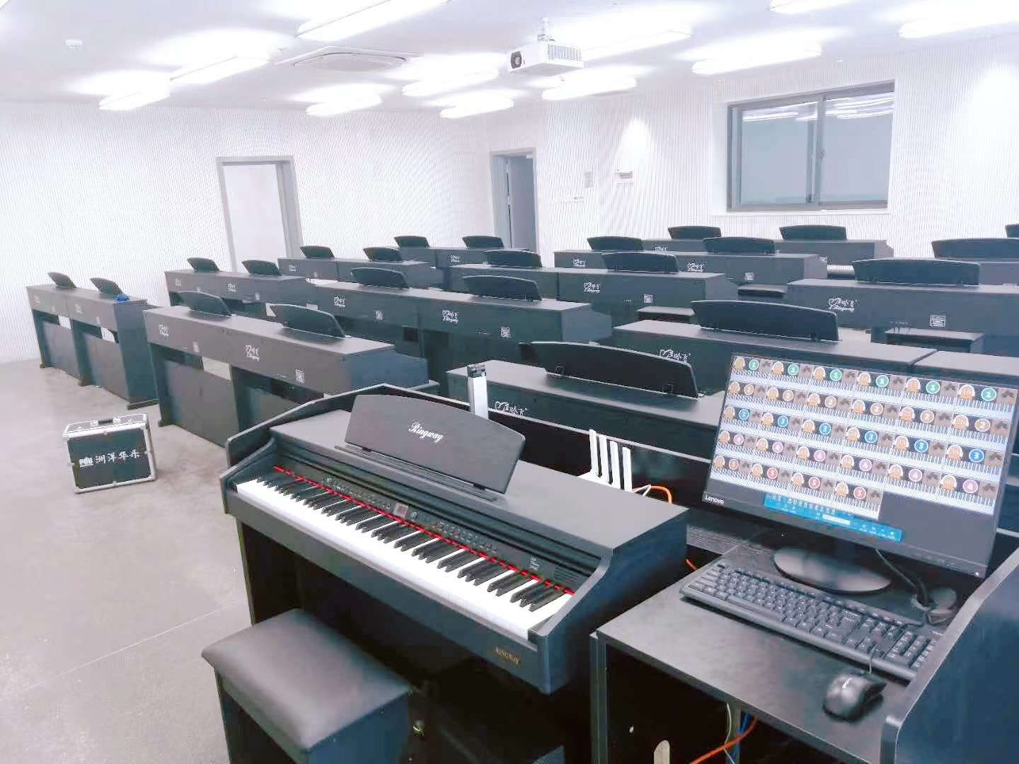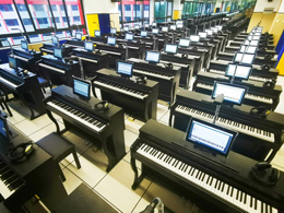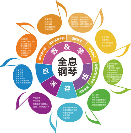 《EduOffice数字音乐电钢互动教室教学系统》是基于全息钢琴引擎技术、五线谱智能编辑技术、钢琴谱多维播放技术等多项独创核心技术以及配置的全息钢琴谱曲库的集成化钢琴互动教学平台,实现了专业钢琴谱讲解、教师弹奏示范、琴谱跟弹练习、左右手分弹练习、“瀑布流”弹奏练习、弹奏自动评测、演奏回放讲评等核心教学应用,满足集体钢琴课堂中教、学、练、评、演、创各环节。