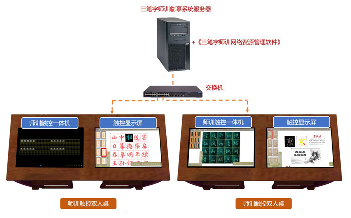 ◆ 师训触控双人桌最大限度节省布局空间、独立操作的软件系统以及丰富全息书法资源满足非书法专业教师和专业书法教师的基础三笔字练习、学习、提升及书法教研的需求;